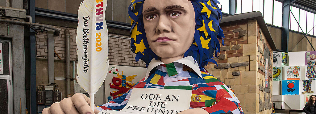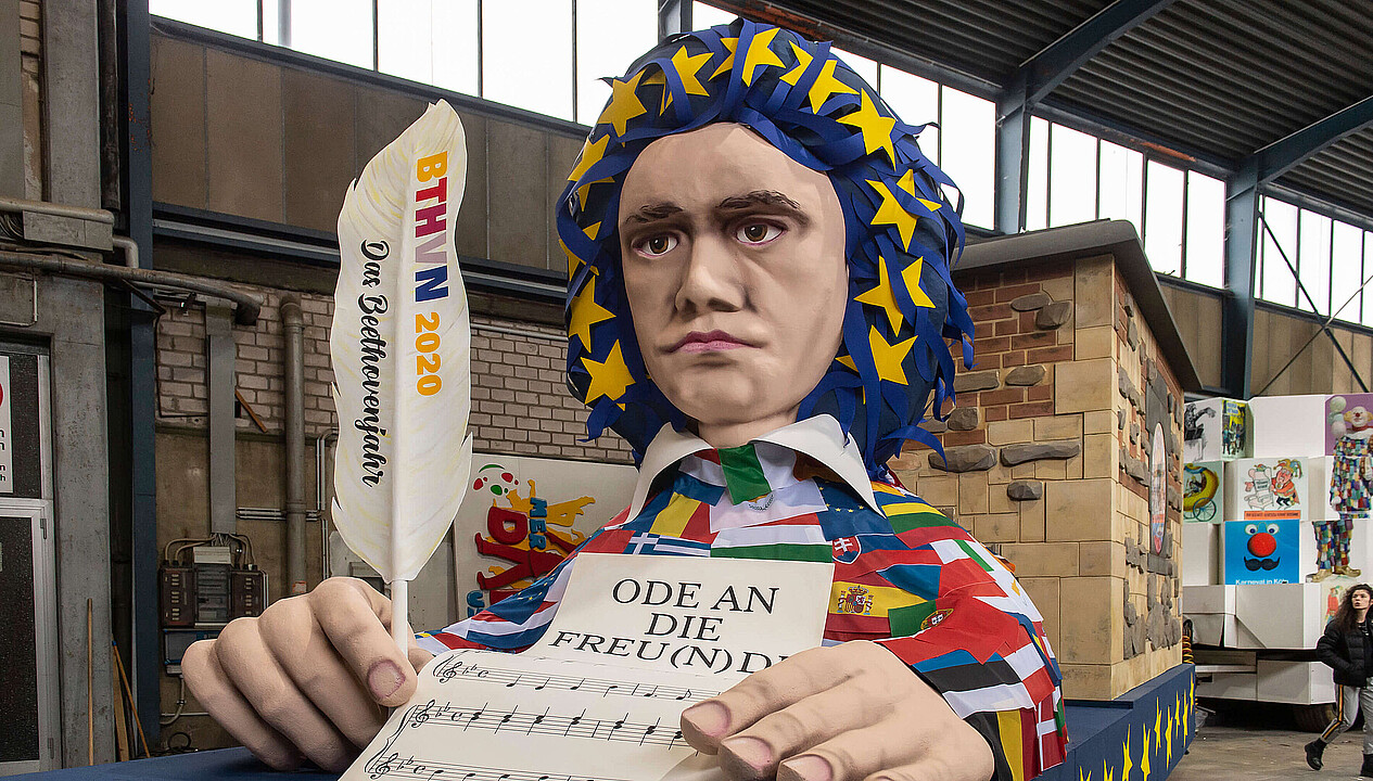 Stellvertretend für alle wurde heute der Kölner Wagen der „Ode an die Freu(n)de“ in der Wagenhalle des Festkomitees Kölner Karneval vorgestellt. Neben Holger Kirsch, Zugleiter des Kölner Rosenmontagszuges und Vorstandsmitglied des Festkomitees Kölner Karneval, betonte Ralf Birkner, kaufmännischer Geschäftsführer der Beethoven Jubiläums GmbH, als Ideengeber des Gemeinschaftsprojektes: „Ludwig van Beethoven hat mit der ‚Ode an die Freude‘ die Europahymne komponiert. Freiheit, Gleichheit, Brüderlichkeit sind die Werte, die er am Hof des Bonner Kurfürsten kennenlernte und für die auch unser Karnevalsbrauchtum steht. Das Motto „Ode an die Freu(n)de“ ist jedoch zugleich ein Hinweis auf die freundschaftliche Zusammenarbeit der vier Festkomitees als Trägerkreis des schützenswerten Kulturgutes ‚Rheinischer Karneval‘.“