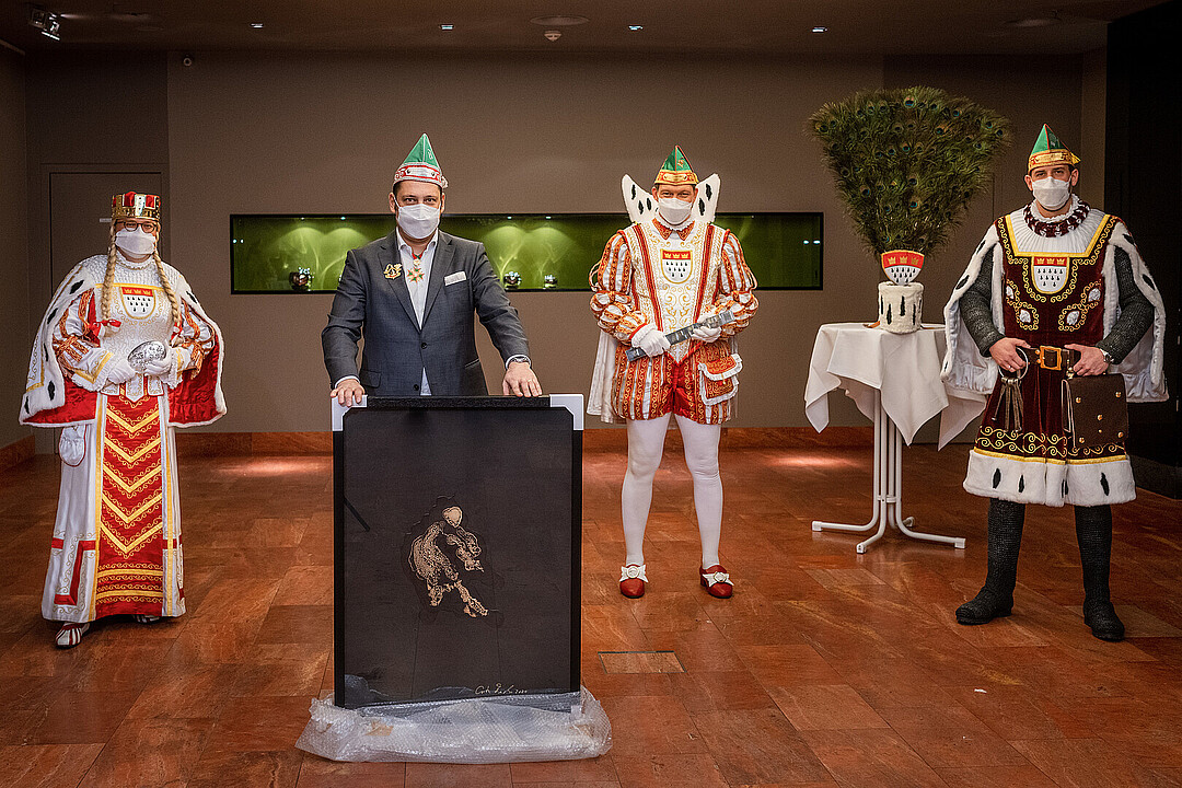 Um das Spendenprojekt anzukurbeln und die ausgefallenen Auftritte zu kompensieren, zeigten die Tollitäten viel Kreativität – und setzten auch hier auf eine digitale Alternative. Über Ebay wurden ganz besondere kölsche Raritäten versteigert, darunter ein privater Auftritt der Bläck Fööss oder der Blauen Funken, signierte Trikots des 1.FC Köln, die Fußballschuhe von Mario Götze oder ein Stein des Kölner Doms. Über die Session verteilt wurden immer wieder einmalige Objekte oder Aktionen angeboten, die größte Summe brachte mit 7.200 Euro ein Meet & Greet mit den Ehrlich Brothers. „Unser ganz besonderer Dank gilt allen Menschen, die für diese Aktion gespendet haben. Künstler, Sportler, Vereine und Institutionen – wir haben ganz viel Unterstützung und grandiose Angebote bekommen. Erst dadurch ist unsere Idee so erfolgreich geworden”, betont Bauer Gereon. Die ersten ersteigerten Objekte und Aktionen wurden gestern vom Dreigestirn persönlich in der Hofburg an die glücklichen Bieter übergeben.