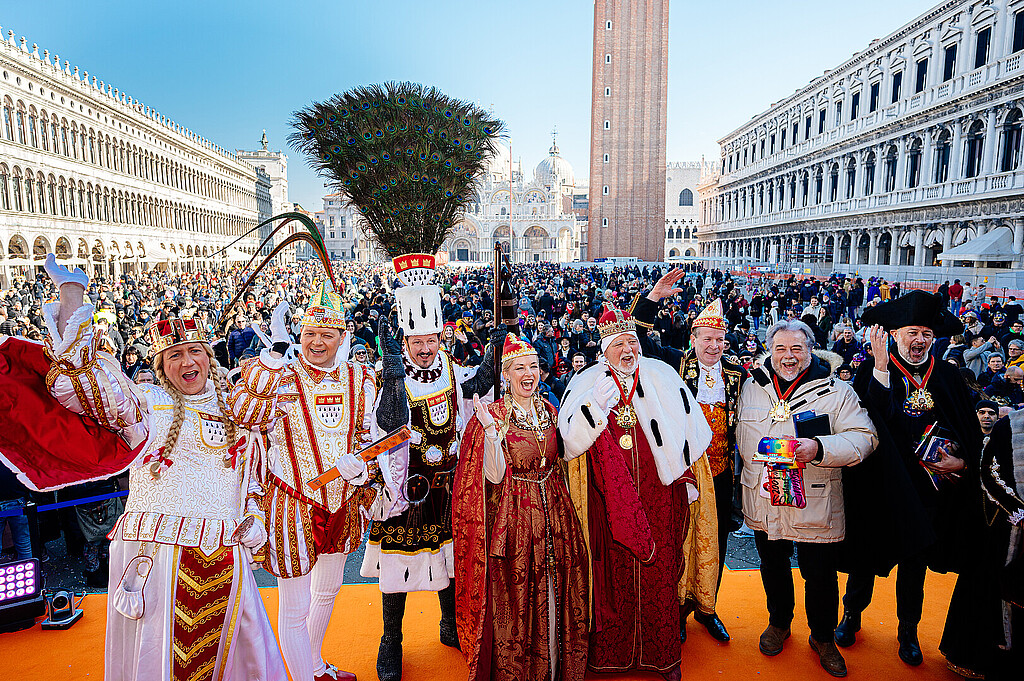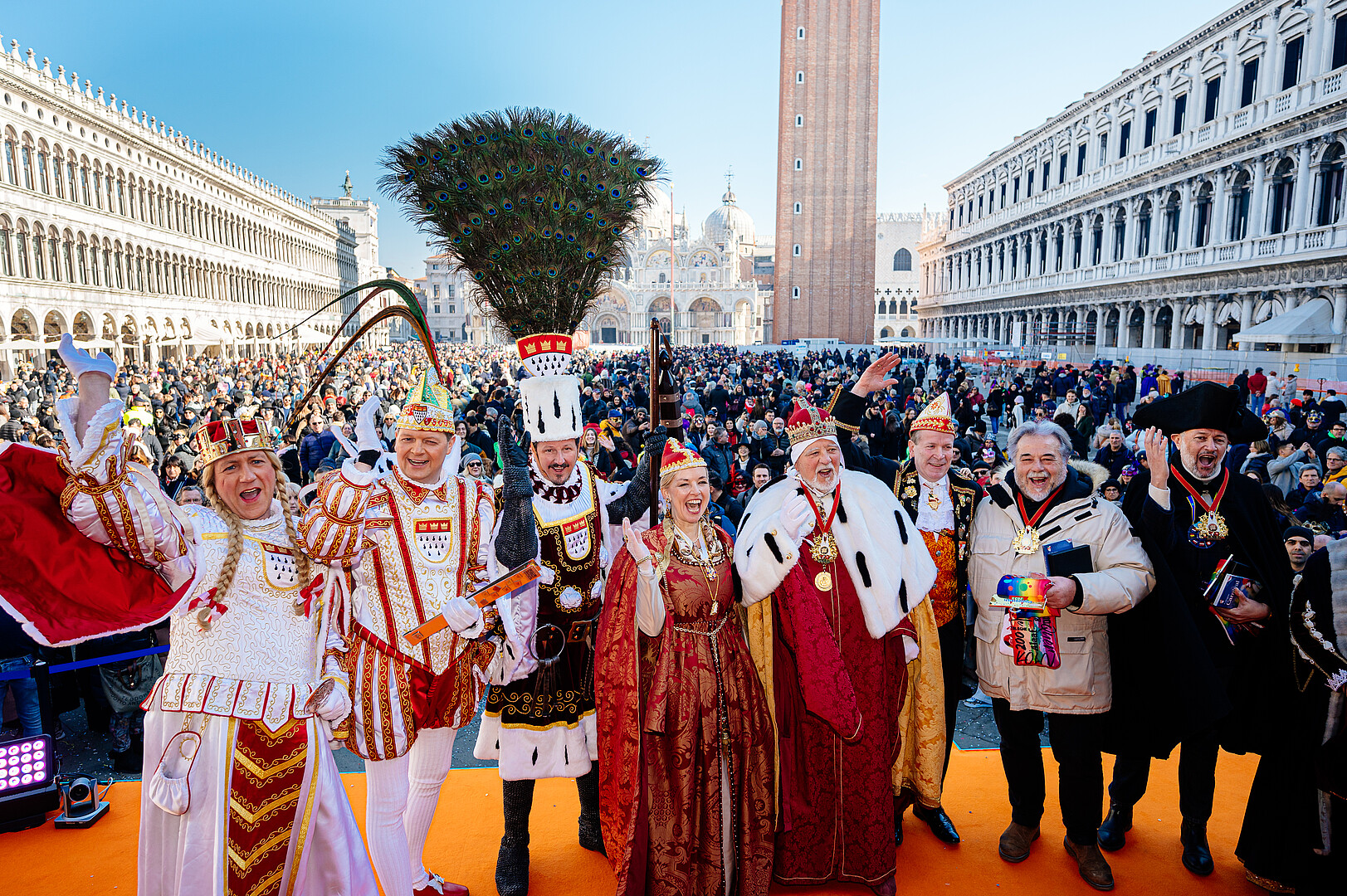 Eine besondere Ehre wurde dem Trifolium bei der heutigen Eröffnung des venezianischen Straßenkarnevals auf dem Markusplatz zuteil. Sie durften gemeinsam mit dem Dogenpaar an der Eröffnungszeremonie teilnehmen und eine offizielle Grußbotschaft an die italienischen Jecken überbringen. Dabei betonte auch Doge Gino, der italienische Herrscher über die Narren, die Gemeinsamkeiten der kölschen und venezianischen Traditionen: „Die Wurzeln des Karnevals sind in beiden Städten ähnlich und die herausragende Rolle beider Karnevalshochburgen in ihren Ländern ist absolut gleich.“